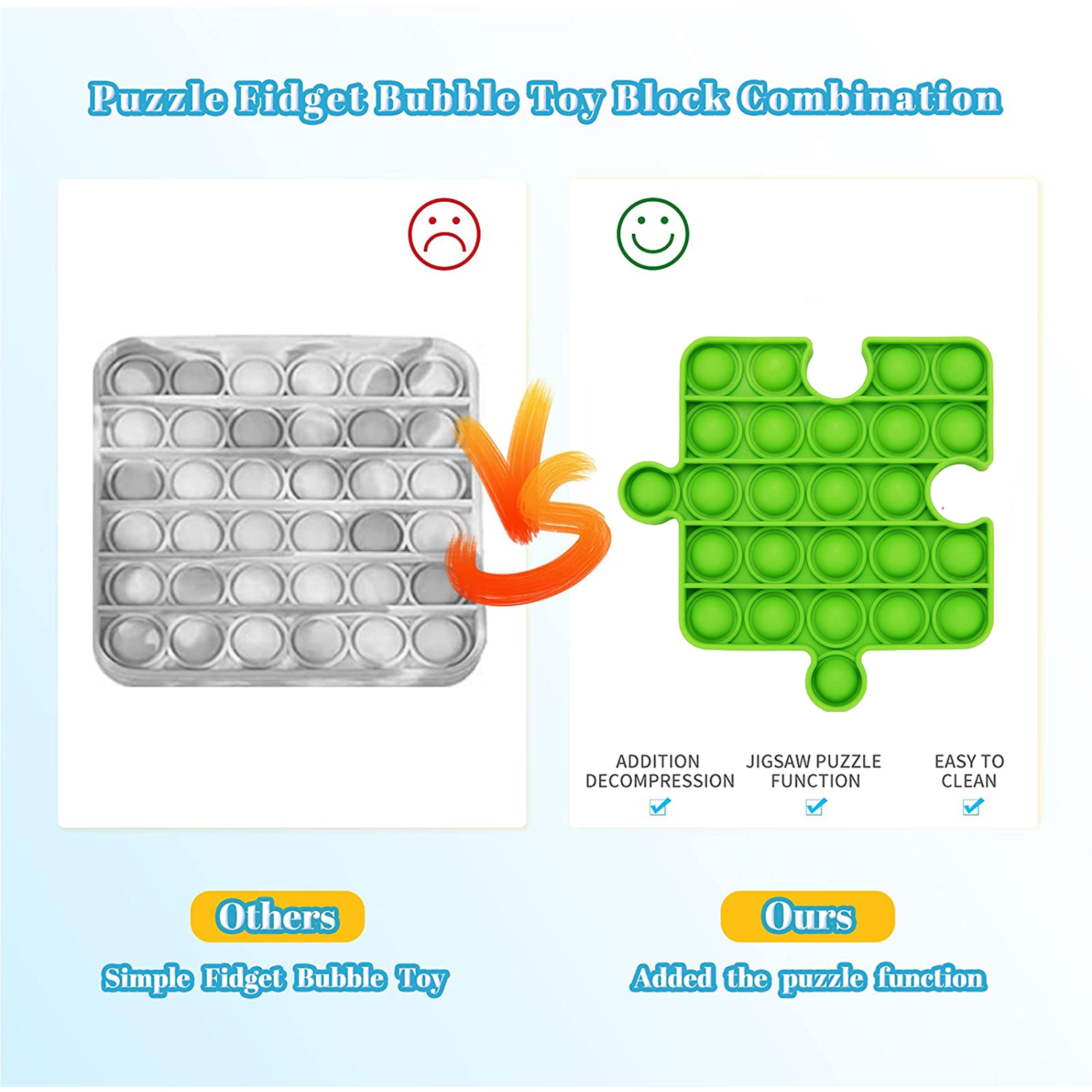 Introducing the Rainbow Puzzle Pop It Set, a delightful assortment of sensory toys designed to engage kids in endless fun! Each piece in this assorted set features a colorful rainbow pattern and a unique puzzle-like shape, inviting kids to explore various tactile sensations and patterns. With the satisfying 'pop' produced by pressing each piece, these sensory toys offer stress relief, tactile stimulation, and imaginative play. Crafted from durable silicone, they are washable, reusable, and perfect for promoting creativity and sensory exploration.