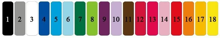 1 Black. 2 gray. 3 white. 4 navy blue. 5. blue. 6 sky blue. 7 dark green. 8 light green. 9 violets. 10. Light purple. 11 brown. 12 burgundy. 13 hot pink.14 soft pink. 15 red. 16 orange. 17 beige. 18 yellow