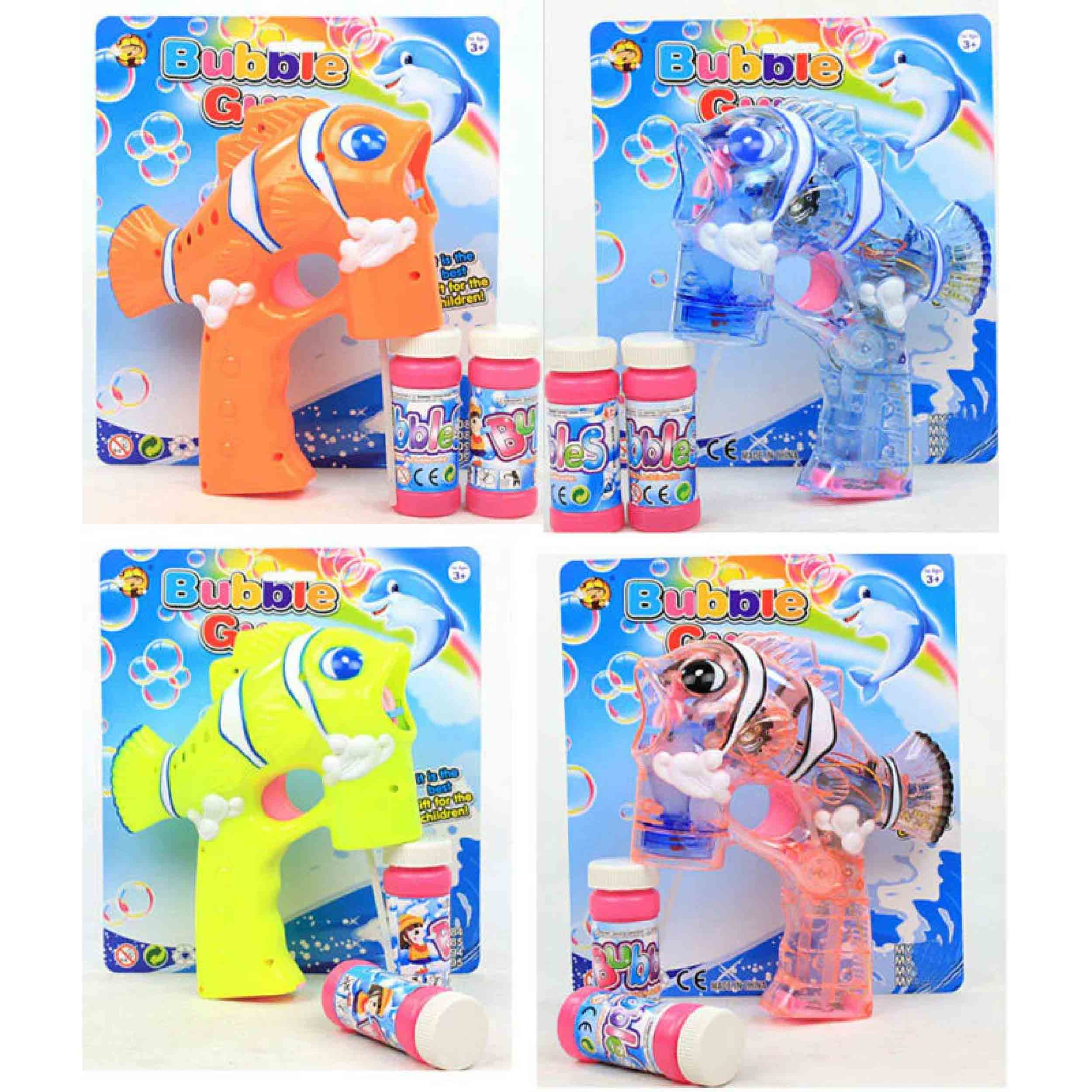 Bring the fun and excitement of bubble play to life with our Fish Bubble Blaster Guns Toy! These whimsical bubble guns are designed to look like colorful fish, adding a playful twist to your child's outdoor activities. Each blaster emits a steady stream of bubbles, accompanied by vintage "ray gun" sound effects and bright flashing LED lights, creating an immersive and entertaining experience. The set includes three bottles of bubble solution and comes with 3 AA batteries included, so kids can start playing right away. Available in assorted colors, these bubble blaster guns are perfect for parties, playdates, or simply enjoying some bubble-filled fun in the yard.